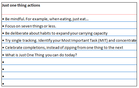 For me, the Just One Thing (JOT) I need to pay attention to is acquiring information. I tend to jump from interest to interest, abetted by access to books and the internet. I scan the environment for topics, then dive into details until the next project tantalizes, and off I go, leaving unfinished projects languishing. I am conscious of my attention deficit tendency, so I limit inputs, like forgoing cable television, deliberately.