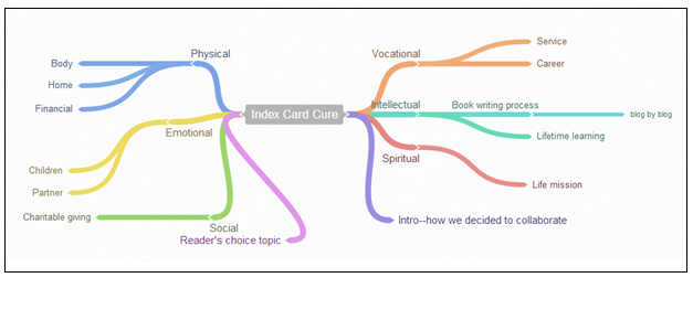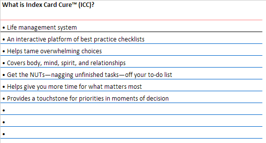 The ICC system is a collection of best practice checklists covering body, mind, spirit, and relationships. The mind map graphic gives a sense for the various areas the Index card cure™ will cover. The lists will help simplify complexities on diverse topics, such as online security, fit tips, and getting things done. ICC will guide you with baby steps and small changes because well begun is half done. Index card cure™ system gives you more time for what matters most and time is our most precious resource.