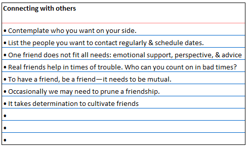 Making friends is an investment in a happy life. We need to be deliberate in increasing our thread count. It’s also important to differentiate between building friendship and business networking. The work colleagues you enjoy eating lunch with may not stay in touch after you leave your position. People come into our lives for a reason, a season, or a lifetime. So, as Winnie the Pooh said, we are lucky for the people who make saying goodbye tough. Give thanks for rewarding relationships.