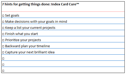 - Set goals. – Have you identified goals that align with your most deeply held values? Have you written them down? This is where an index card can help. Write them and refer to them. Be intentional and move deliberately in the direction of your goals. If you don’t care where you’re going, any road will get you there.