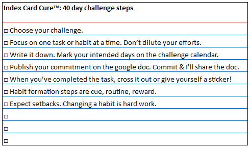 If you choose to participate, I will share a google doc for the challenge participants. It will be a private forum for those who are working on their goals. Whether you join, post, or work on your goal is up to you, but public commitment and tracking help reinforce goal accomplishment.