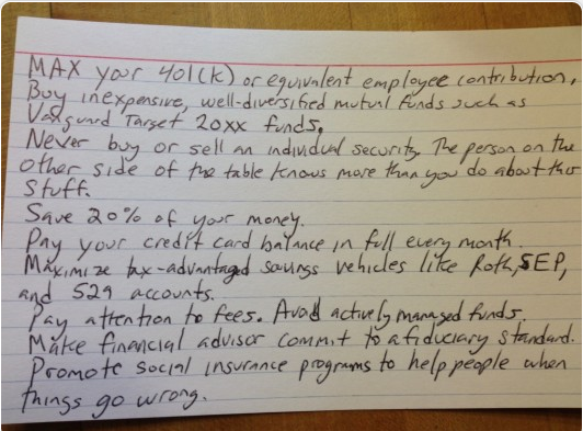 Straightforward financial advice on one index card… Of course, having the plan, financial or otherwise, is one thing while implementing is a bigger issue.