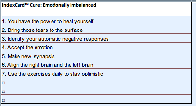 I asked if she could distill her message into an IndexCard® Cure soundbite. Seven steps to reducing stress and re-balancing: