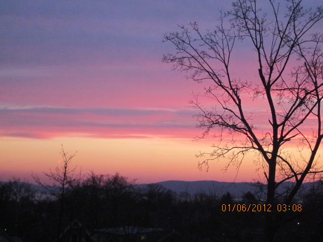 This sunset provided color and contrast: dark branches, stiff and stark framing a riot of color surprisingly in the sky. It made a dutiful walk of the dog into a magical journey. (Picture taken by Bennett Collen)