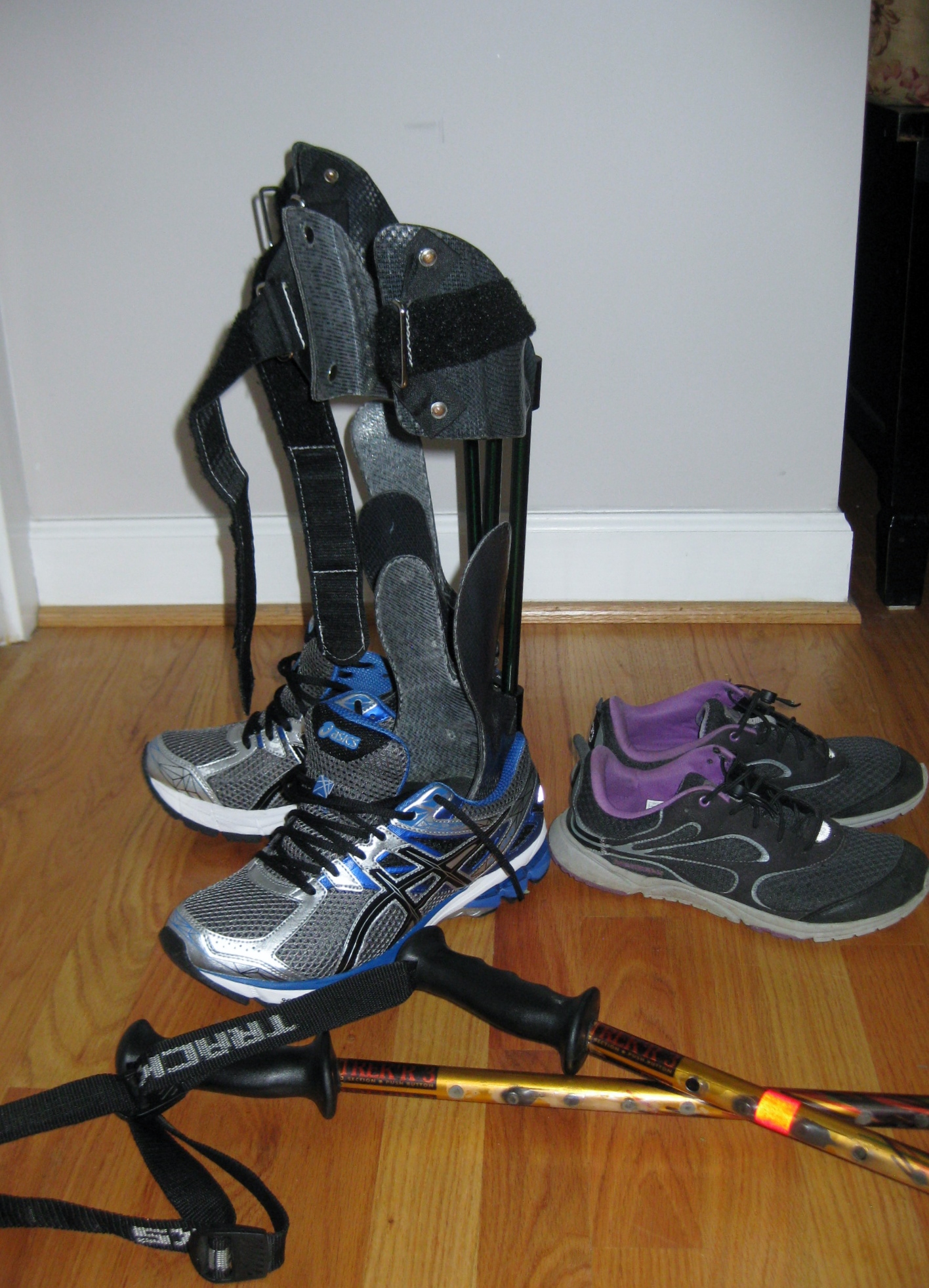 Learning something new is hard work. You’re not sure if the costs of time, energy, and looking inept will outweigh the potential benefits. After having the braces for a month, I am still adjusting to wearing devices that are like downhill ski boots without hinges. Walking in them requires a rocking motion and trusting that my toes will not catch and leave me flat on my face. The rhyme, Step on a crack, break your mother’s back, runs through my mind during my IDEO adventures. While I have never walked in stilts, that’s my brace-enhanced gait. Navigating flat ground is relatively simple, but uphill, downhill and steps are challenging terrain. And guess what? There aren’t many places that are absolutely flat, so for balance, I need hiking poles. Walking with the braces is comparable to weight lifting–good exercise on a limited basis–but not suitable for driving or even flying. But I am luckier than others I see at the clinic. At the end of my IDEO-wearing sessions, I can remove the braces and still have ankles that work, even if not pain-free.