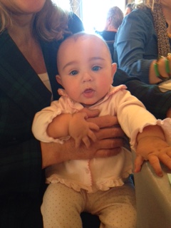 I actually went to a luncheon with my 6 month old granddaughter yesterday. Of course I arrived a half hour late — it was so much work to get us both into the car! Fun of course, but so much work.It was a daunting undertaking, but then I remembered my cousin Lia’s attitude: “Well, we’ll try it!” she always said. And she she made it to most family events with that great positive attitude. The car seat and the diaper bag were too heavy to carry with the baby, so I stuffed toys, a diaper and a bottle into my purse and carried the baby. With the help of my sister-in-law Judy and our friend Charlotte, Eliza sat on laps and we enjoyed the lunch!