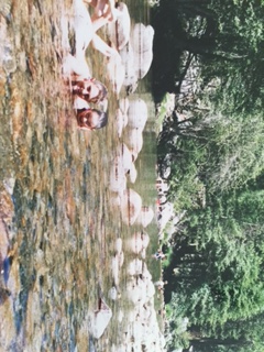 I remember a moment of terror. I sat on a rock in the stream in a National Park. (I don’t even remember which one. My first husband will remember.) I was cooling my feet after finishing a hot hike through the woods, enjoying watching the kids frolic and swim. Too old to put my bathing suit on in the car and “swim” in the knee deep rocky water, I contented myself with lowering my body temperature through my feet, splashing my family and vicarious swimming through my children. Abigail was floating around me, lying back in the water, relishing the coolness of the fresh mountain water and I snapped a photo of her.