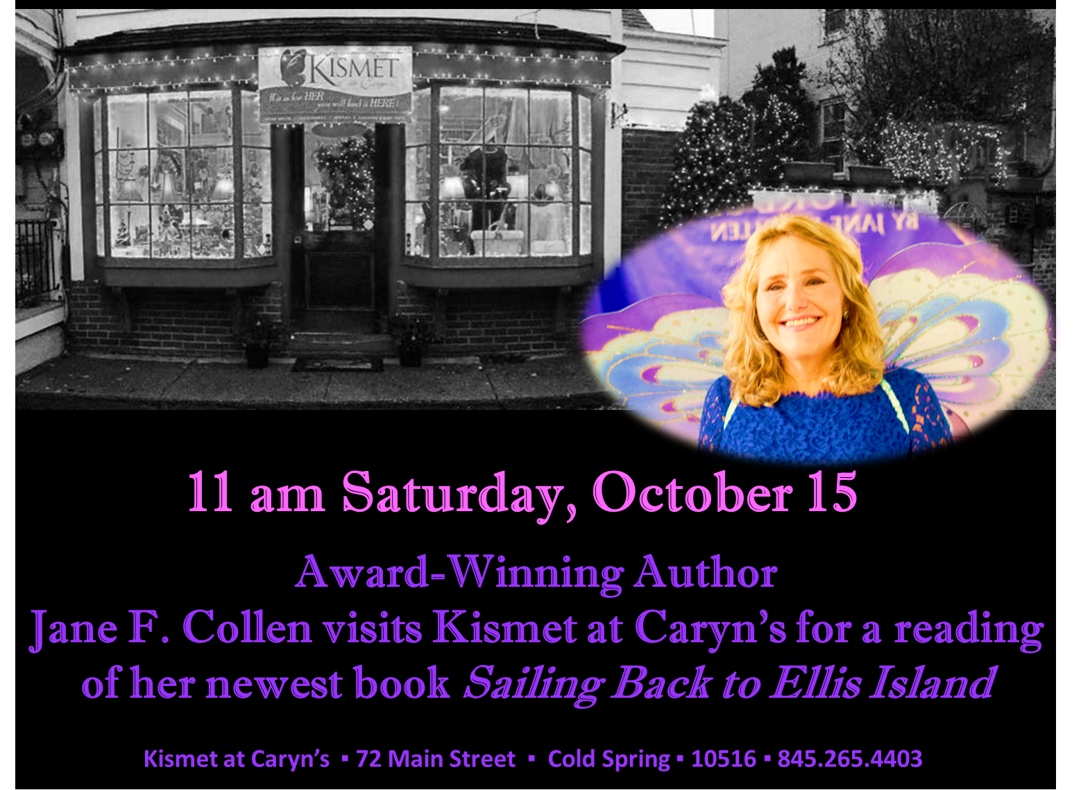 Kismet is a great gift store with a secret garden right on Main Street in scenic downtown Cold Spring. Just my kind of place! The magic of the leaves changing to all hues of beautiful fall colors is the perfect back drop for a sneak preview of my new book: Sailing Back To Ellis Island.