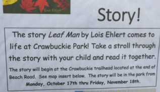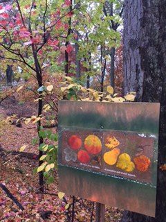 illustrations featuring an element visible in the surroundings behind the story board: leaves! The yellow, green, red, orange, and rust leaves clustered around the signs posted along the walks and were reflected in the pictures.