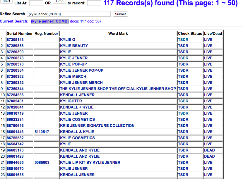 Since 2011 Kylie Jenner alone has filed almost 50 applications to register her name, in various permutations for a slew of goods and services. (I did not have the heart to count the total number of Kardashian applications). KYLIE Q and KYLIGHTER and some of the more interesting variations of the name might just be able to obtain registration. Several have been approved but some have been abandoned through failure to prove use. Some of Kylie Jenner, Inc’s applications have gone abandoned through failure to respond to Official Actions. But some of the trademarks are being outright rejected.