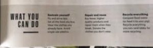 The first step might be a fashion tip – older things can be combined with a new fashion and repurposed in my own wardrobe. Ok, maybe a skill I need to acquire. The fast fashion mindset is a major culprit of the burgeoning clothes landfill. According to research, because clothes are so cheap people now wear their clothes a third fewer times than before 2015 before tossing them. The solution is simple: keep using your clothes and don’t buy more, and there will be less waste. But what about fashion? (And what about the economy? Those fashionistas keep the economy moving.) Am I skillful enough to use Rent The Runway to perk up old pants with a new, borrowed sweater or jacket? I’ll try…