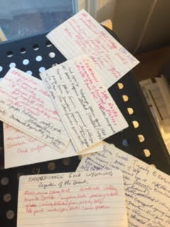 Truth be told, I am feeling a little old fashioned. Should I not have all my notes typed on my computer, easily searchable? But then I recall that Joan Rivers used index cards to write down jokes she invented and filed them in her room full of index card file drawers by subject matter: