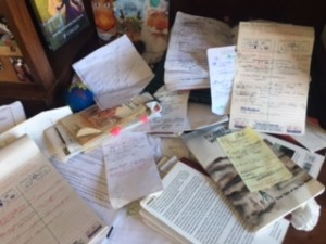 Sure, I created this mess. I get inspiration in weird places, from a combination of observing people and sightseeing – even in my hometown. So I find a scrap of paper and a writing instrument (usually I can only find a crayon in my purse, somehow pens go the way of sock mates) and write down my brilliant thought, shoving the paper in my pocket or bag. Sometimes I find them in time, sometimes I don’t. If I only used paper, I would probably retrieve them more diligently, and just throw all the scraps into one pile. That way, any time I need inspiration, I could reach in and grab one. But I also type notes on my phone and laptop, and in a notebook, and mark pages and notes in books… often, I need the god of randomness to guide my hand to just the right paper to help me move my story along.