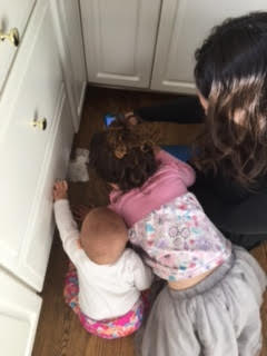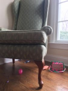 When the baby was happy for a minute I went to round up the socks and discovered why everything had been quiet for two minutes. (empty chocolate wrappers in the corner.) I bent down with the now crying again, (heavy!) baby in my arms and scooped up a sock from the floor, one from under a table and one on the chair (only 3?) and stuffed them into my pocket. Before I could continue my search and rescue, I got asked to look at the thermostat in the dining room. Did I mention the HVAC system was not working correctly so there were two men constantly asking me questions as they tried to fix it? And did I say that all this activity was happening, including the crying baby, to the backdrop of three men running noisy electrical equipment outside, trying to do a spring cleanup of the yard and get rid of all the dead tree branches?