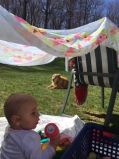 The spring sun was too hot for the baby. Her hat kept slipping off. I didn’t want her to get sunburned. The patio umbrella hid, buried somewhere in the garage and in any case, too heavy for me to carry by myself.