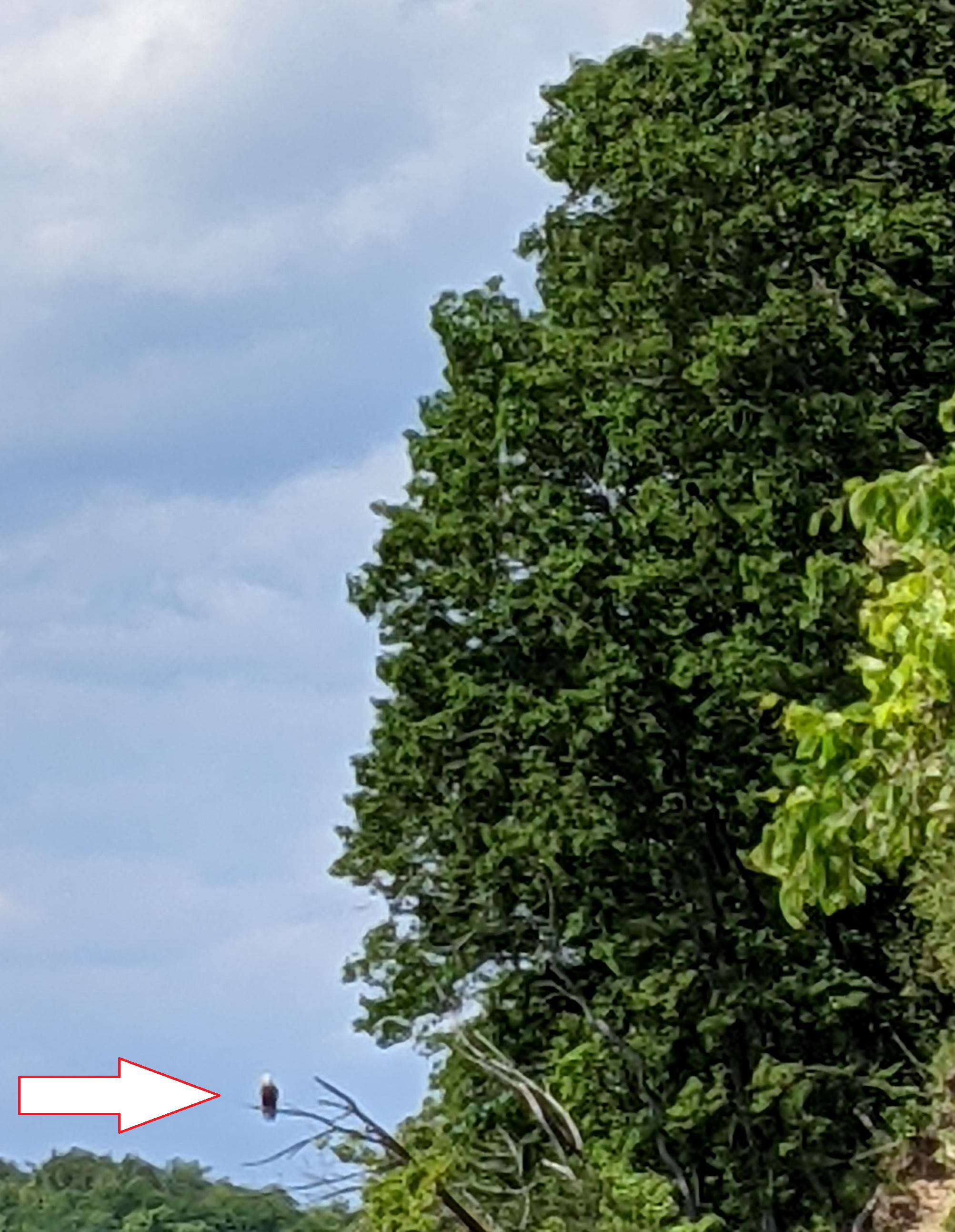 From our vantage point on the banks of the Potomac River, Ginny, Kay and I saw “Sister” Eagle in a tree. Bright sunlight made taking a photo an act of faith — point, shoot, and hope for the best. [Blame the photographer for the tiny image.]